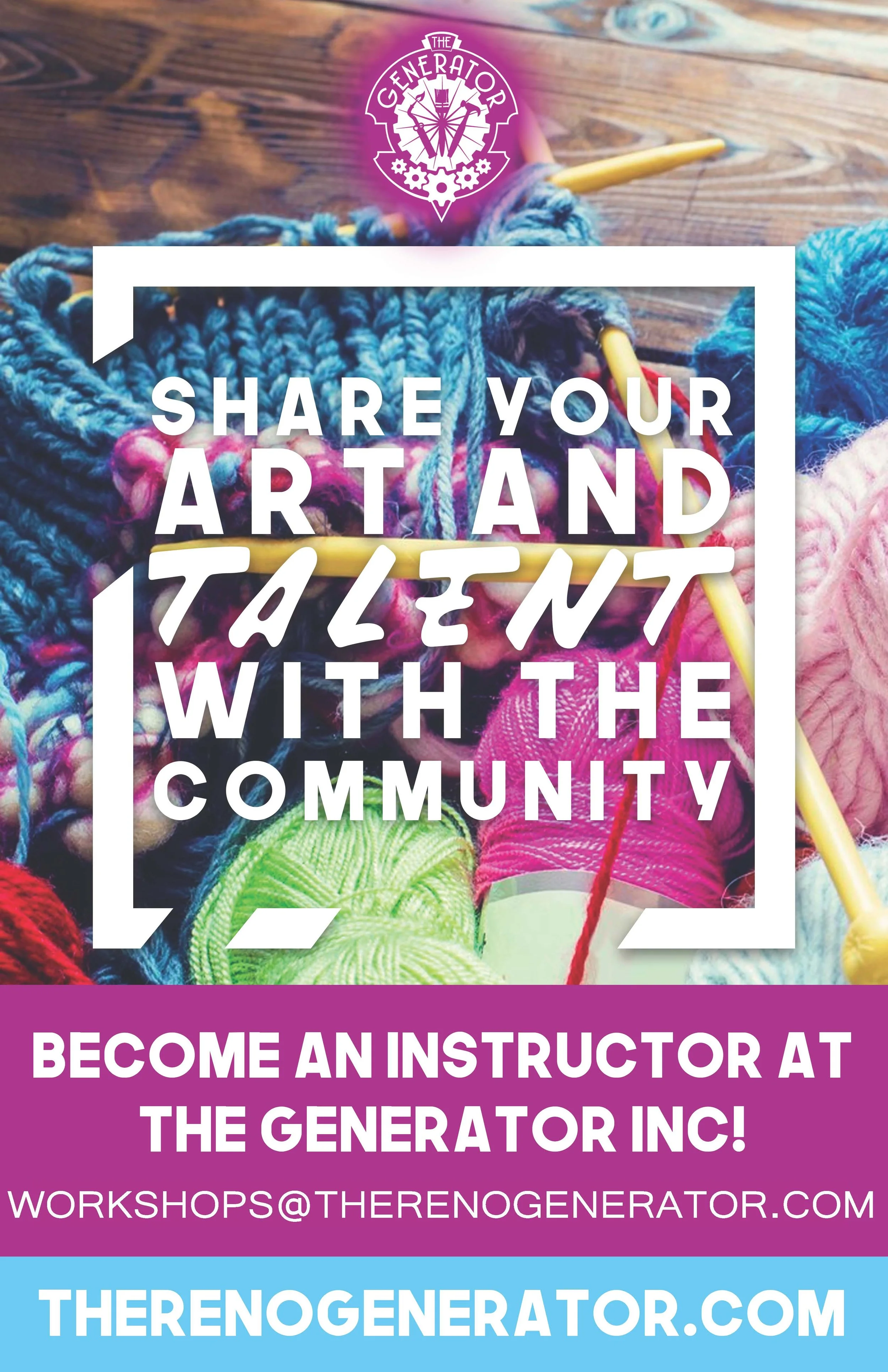Questions about teaching at The Generator? Have questions or comments? Reach out to workshops@TheRenoGenerator.com or stop by The Front Desk during our open hours.